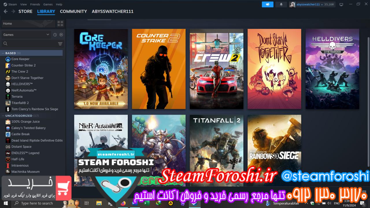 بازي هاي موجود در اکانت : CS2 prime-Rainbow 6S-Titanfall 2-NieR automata-Helldivers 1-Terraria-Don’t starve-Corekeeper-Crew 2
