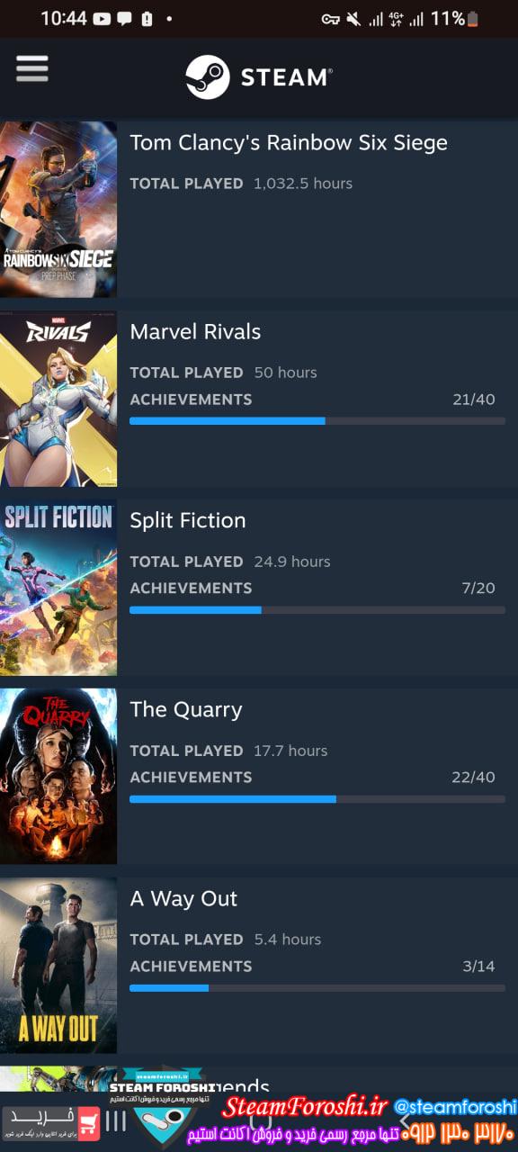 توضيحات : اکانت استیم Marvel Rivals پس سیزن یکو کامل داره ۱۲۵۰ تا لاتیس هم داره رینو هم لول ۱۵۰ تقریبا با ۱۰۰۰ ساعت تایم پلی تمام ابن بازی ها هم داخل اکانته