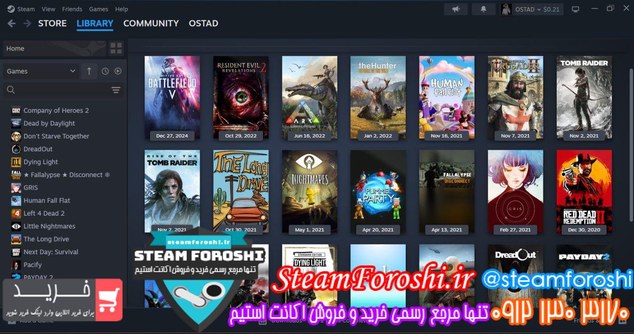 بازي هاي موجود در اکانت : ARK: Survival Evolved Resident Evil Revelations 2 Little Nightmares Red Dead Online TheHunter: Call of the Wild Battlefield V Company of Heroes 2 Next Day: Survival DreadOut Disconnect, Fallalypse و ب Golf It! Don’t Starve Together Pummel Party Stick Fight: The Game SpeedRunners Stronghold Crusader 2 Rainbow Six: Siege Brawlhalla Rocket League Counter-Strike 2 Fall Guys Tomb Raider Dead by Daylight Dying Light ShellShock Live Left 4 Dead 2 Pacify Human: Fall Flat