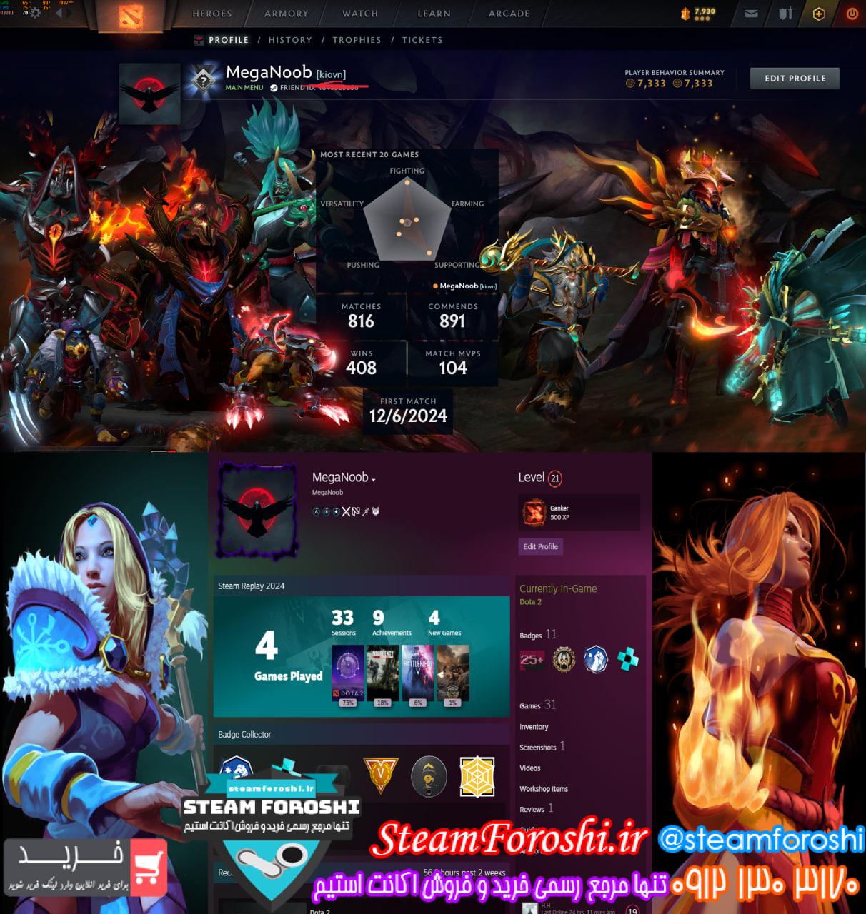 توضيحات : اکانت استیمم لول 21 هستش و کلی از بازی هام لول هاشون فول شده ؛ بازی دوتا2 لول 30 هست و کلی ایتم ها و ایمرتال های با ارزرش داره ارکانای لژیون رو دارم و چندین کالکتر کش باز کردم توش که ست های زیبایی هم داده ؛ به دلیل بدهی زیاد و قست های زیاد وام بانکی و نیاز مالی مجبور به فروش اکانت شدم . اکانت اصلی خودمه و خیل یبرام با ارزش بوده .