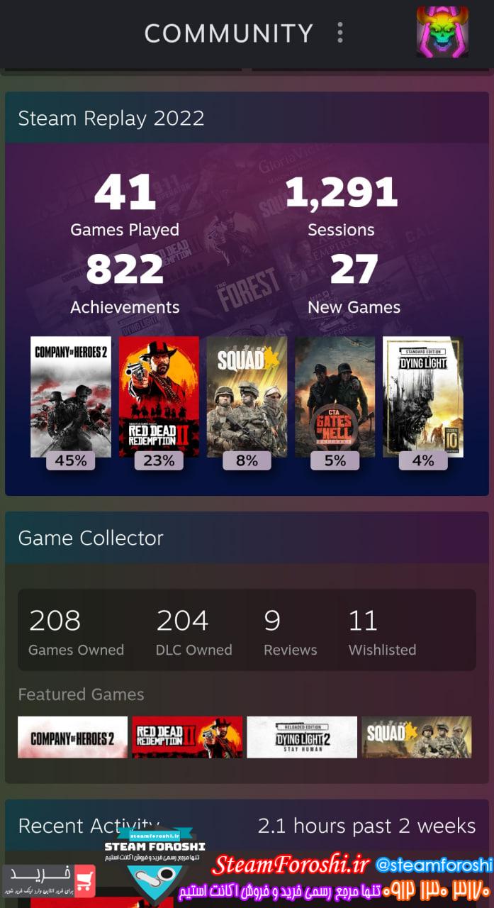 توضيحات : سلام اکانت استیم فروشی با بیش از 200 گیم متنوع آنلاین و آفلاین لول 23 فقط گیم DayZ داخلش بن شده راجب قیمت پیام بدید راه میام فروش فوری پول لازمم Red Dead 2 Gta v Far cry 6 Company of heroes 2+full dlc The crew 2 Squad Call to arms 1-2 Arma 3 Valheim Dying Light 1-2 Age of Empires 3-4 Sea of thieves Amercian truck The withcer 3 Down of war 2-3 Titan fall 2 chivalry و .. خیلی گیم دیگه