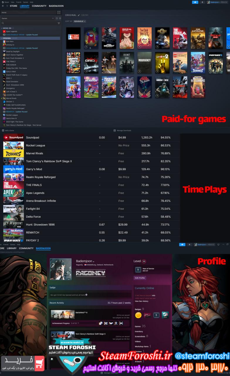 بازي هاي موجود در اکانت : Aim Hero, Among Us, Arena Breakout: Infinite, Dead by Daylight, Don’t Starve Together, Euro Truck Simulator 2, THE FINALS, FOR HONOR, Friday the 13th: The Game, Garry’s Mod, Grand Theft Auto V Legacy, GRID 2, Hand Simulator, Hunt: Showdown 1896, Insurgency, Left 4 Dead 2, LEGO The Hobbit, Marvel Rivals, PAYDAY 2, PUBG: Battlegrounds, Realm Royale Reforged, REMATCH, Rocket League, Saints Row IV, Stick Fight: The Game, Tom Clancy’s Rainbow Six Siege – , Totally Accurate Battlegrounds
