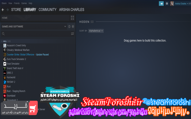 بازي هاي موجود در اکانت : pay fay 2,stronghold 2,CSGO,GTA V,Rainbow Six,Chivalry medival warfare,Rust,Assassin’s creed unity, hurt world