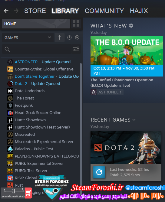 بازي هاي موجود در اکانت : ASTRONEER 30$ Rust 40$ Pubg 30$ Frostpunk 30$ The forest 20$ Hunt : showdown 25$ Miscreated 20$ Dont starve together 15$ Cs:go dota 2