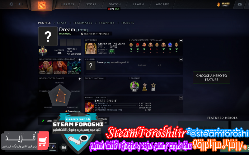 توضيحات : بازی دوتا روشه با آیتم هایی که خود بازی میده. کانداکت ۱۰۰۰۰ واقعا بازیای رنک بازیکن های خوب با همکاری و تیمی بازی کردن مینداخت بم.بیشتر از ۲۰۰ تا بازی داره. وین ریت هیرو های خاصی توش بالاس. نزدیک ۵۰۰۰۰ تا شارد هم داره هر اسکینی بخواید میشه بخرید باش.
