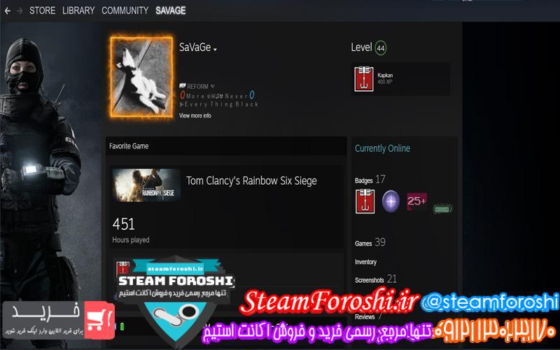توضيحات : همینطور که میبینید لول 44 استیم و کلی بازی های خوب از جمله r6 csgo prime gtav watch dogs left for dead 1 2 portal و…..