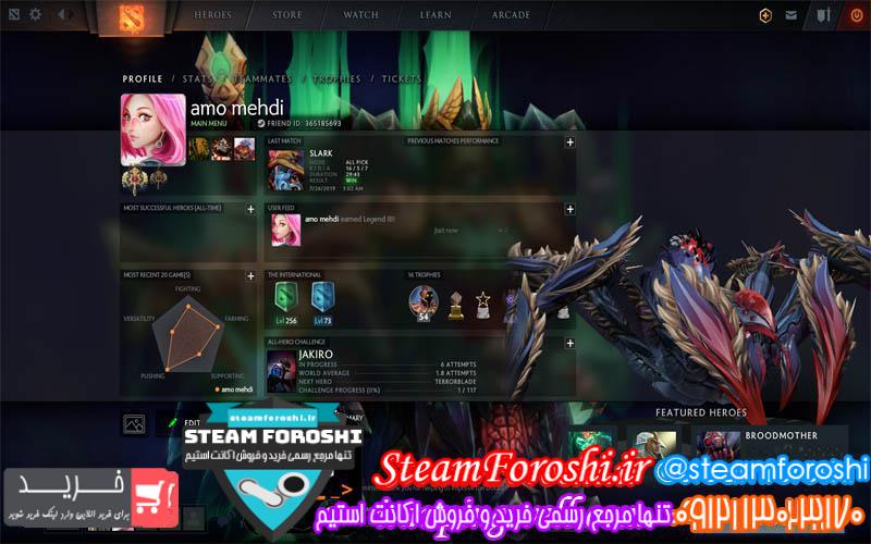 آيتم هاي بازي : بوک ۲۰۱۸ تا لول ۲۵۶ رفته ایمورتال lion داره.ایمورتال underlord,veng,ancient apparition .سه عدد ست کچ قدیمی wrath king ,chen,broodmother و مقداری ست و ایتم